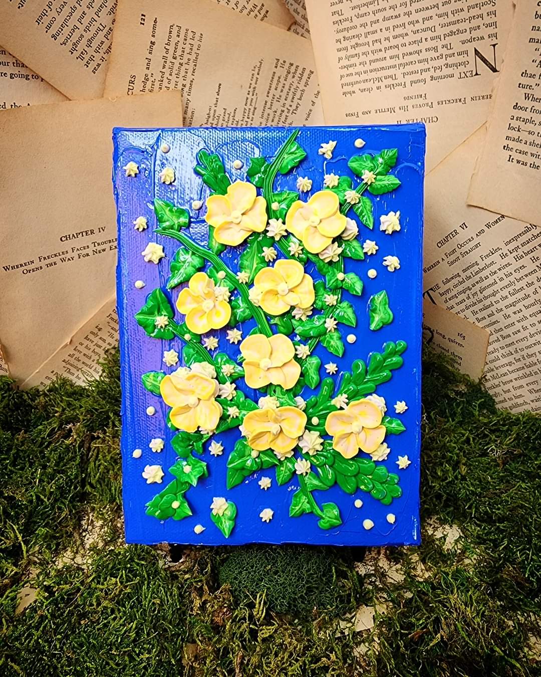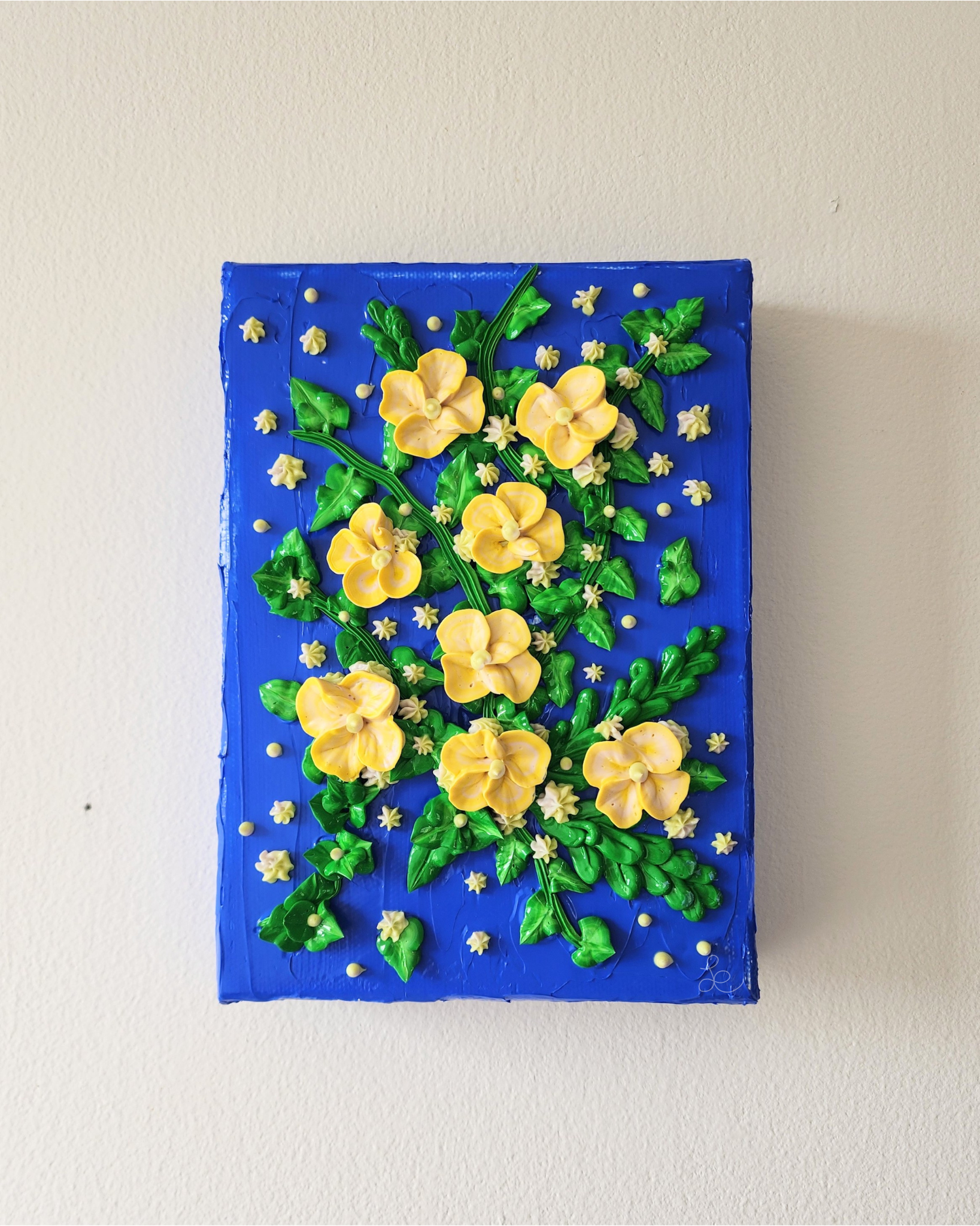 "Sunshine Vines" features petals in varying blues and yellows, all sculpted out of a thick acrylic paint. Each element (leaves, petals, stamens, etc.) is created by hand, making this painting truly organic and one-of-a-kind.